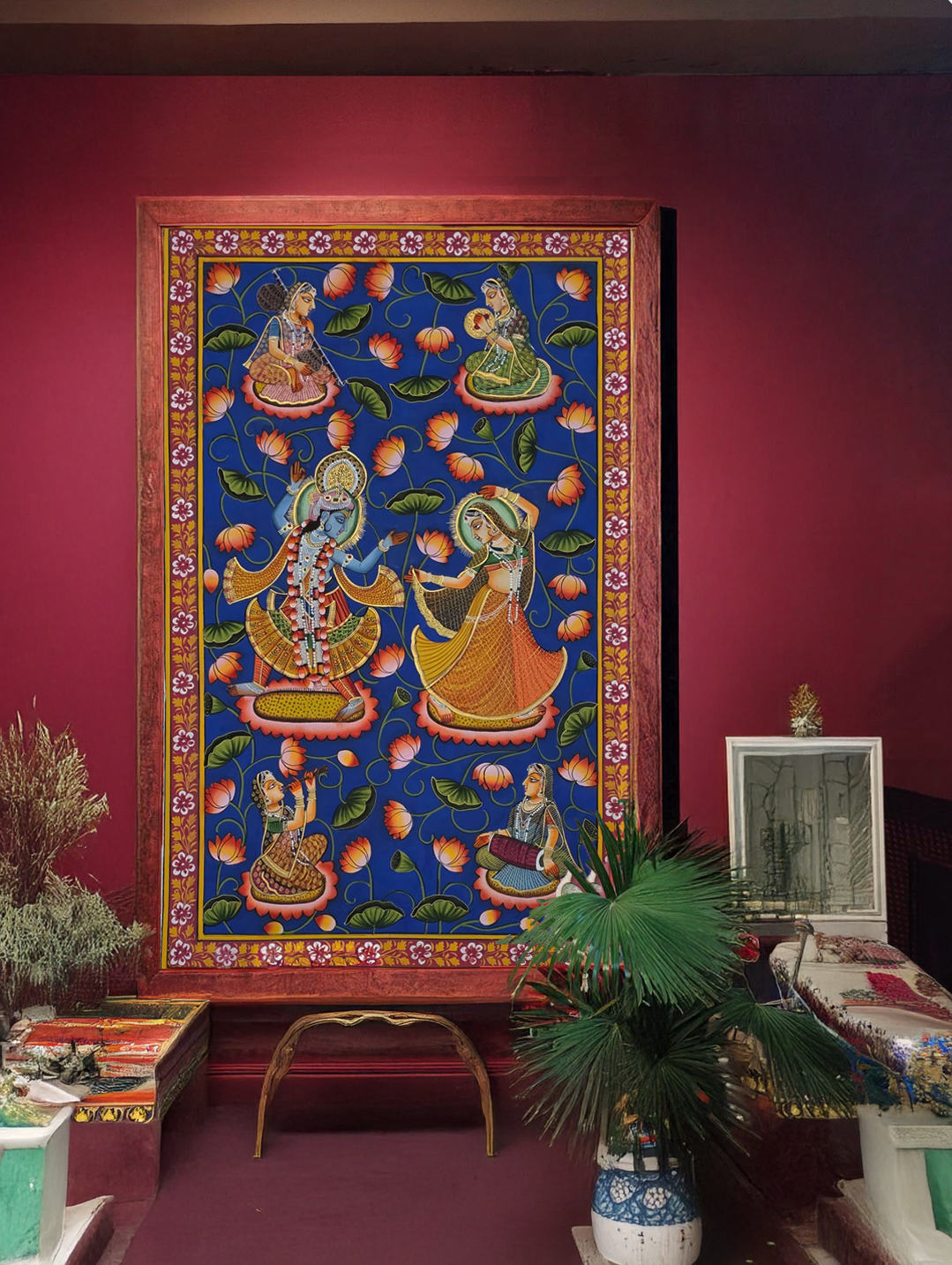 Hand-painted in the traditional Nathdwara style, the artwork beautifully blends intricate detailing, rhythmic composition, and soft yet vibrant tones. The repetition of lotuses symbolizes purity and spiritual awakening, while the serene expressions of each figure evoke divine bliss.